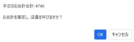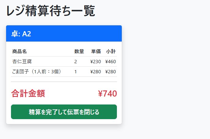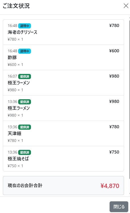 注文したすべての料理が提供済になると「会計」ボタンが有効になります。このボタンを押すと、レジへ会計情報が飛び、以降の追加注文はできなくなります。