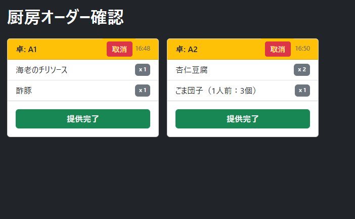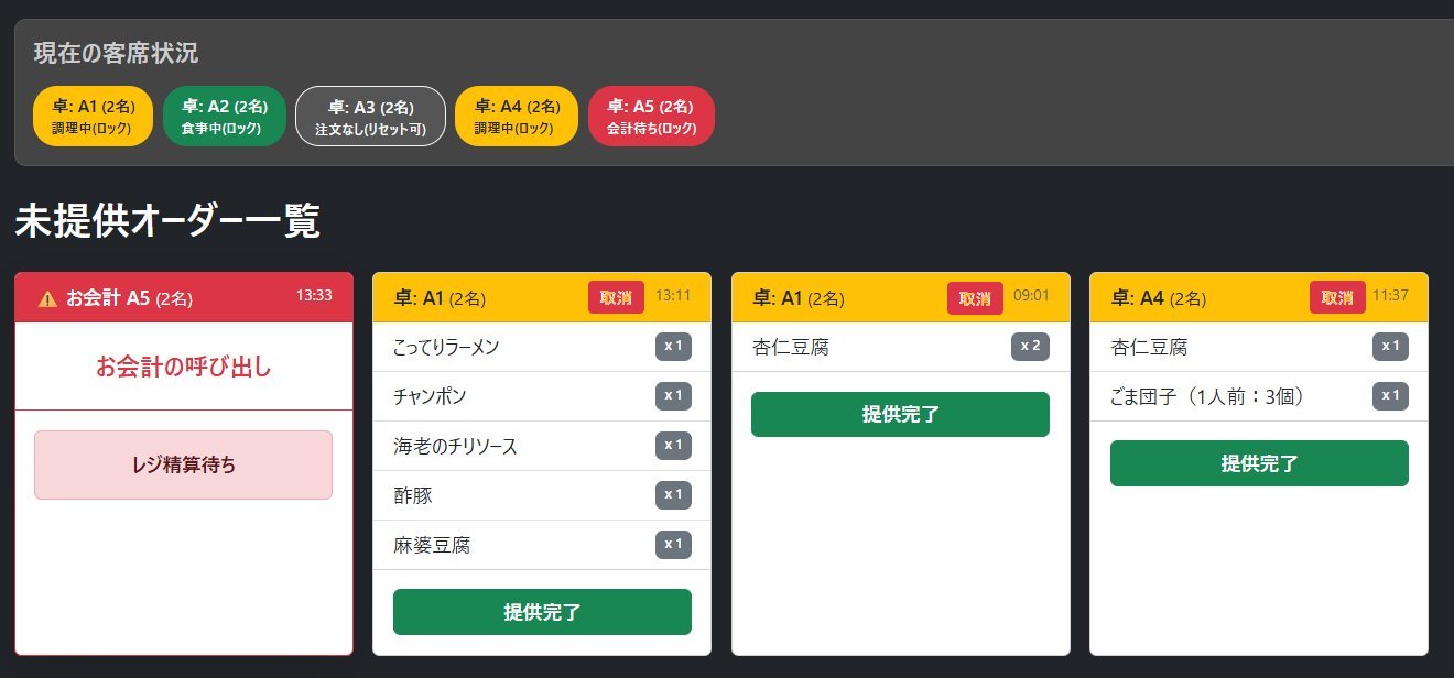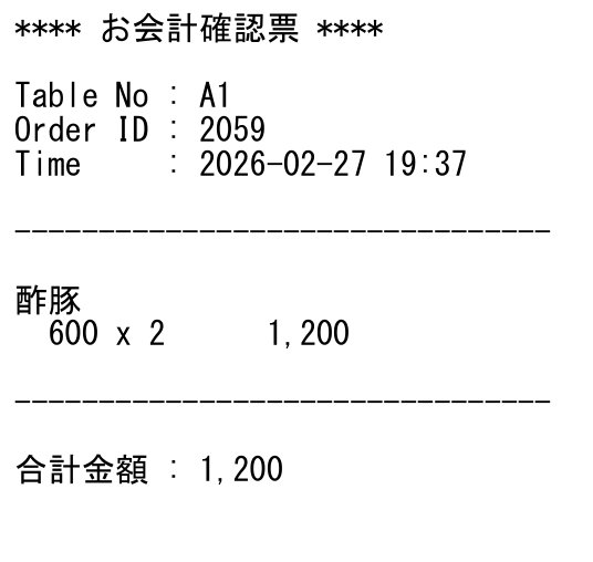 - 自動印刷: 厨房で「提供完了」を押すと、指定プリンタに印刷されます。