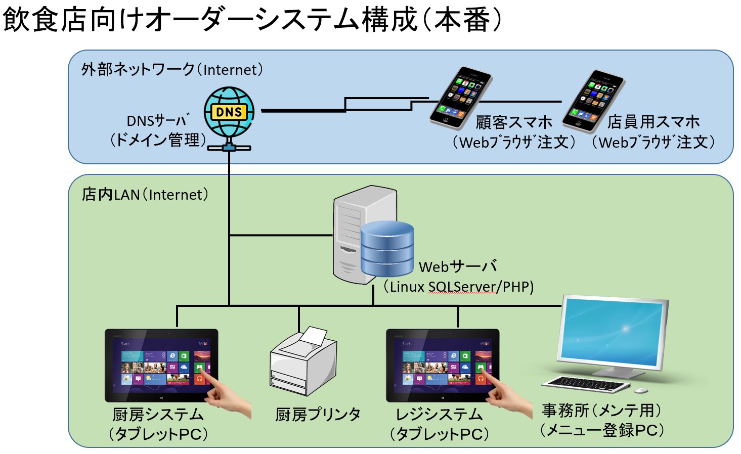厨房システム、レジシステム、メンテナンスは店内Webサーバを利用することになります。