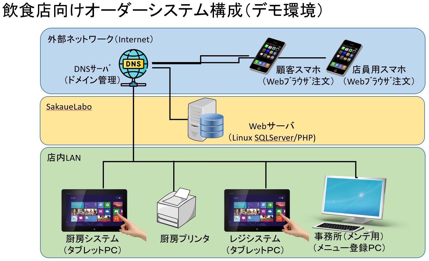 厨房システム、レジシステム、メンテナンスともSakaueLabo上で動作することになります。
